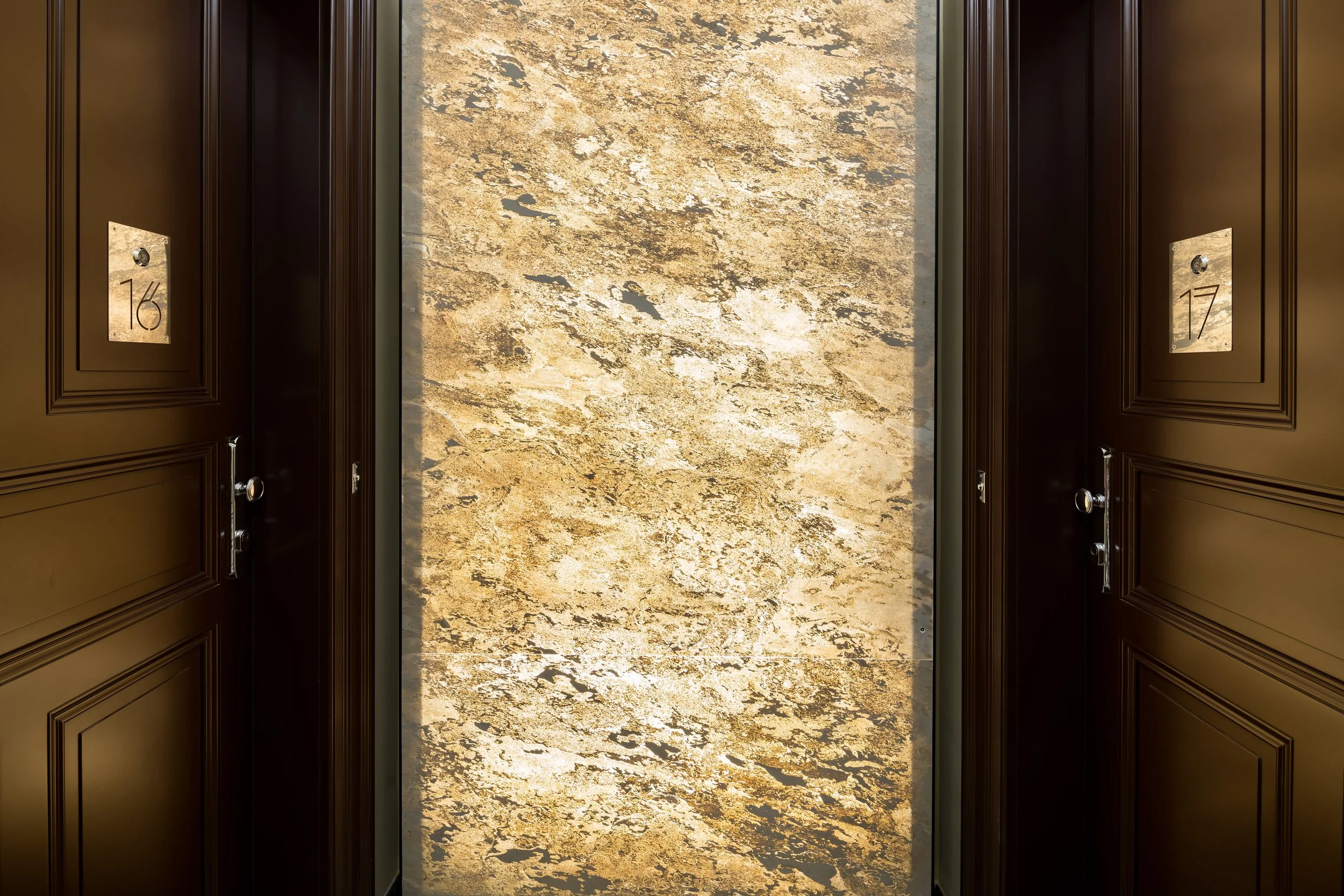 The common areas draw inspiration from Parisian boutique hotels, featuring textured plaster, large-format mirrors, designer chandeliers, preserved vaults, and a replica of the original checkerboard flooring. This is what defines Oldřichova 15.