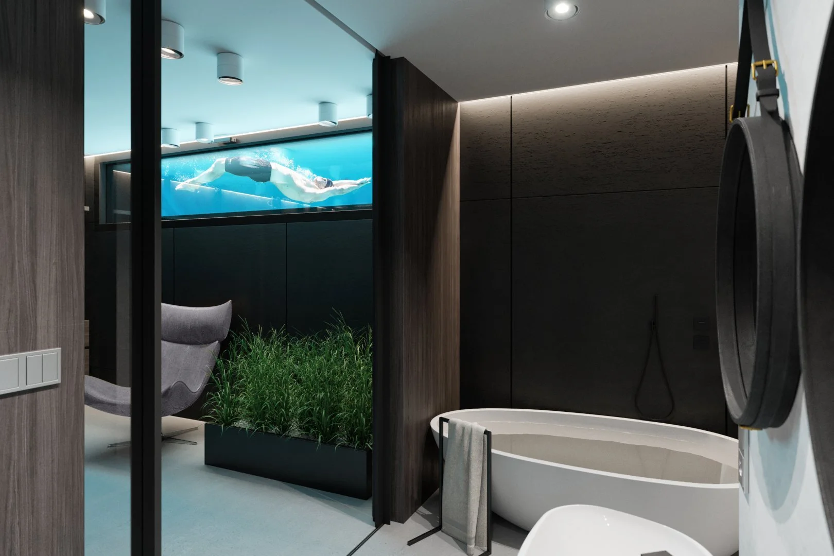 The direct, lightweight staircases within the house reflect the rotation of the building’s mass. The core consists of a hall with views and a gallery that connects the different levels. The house meets the expectations of a discerning investor, prioritizing both comfort and aesthetics.