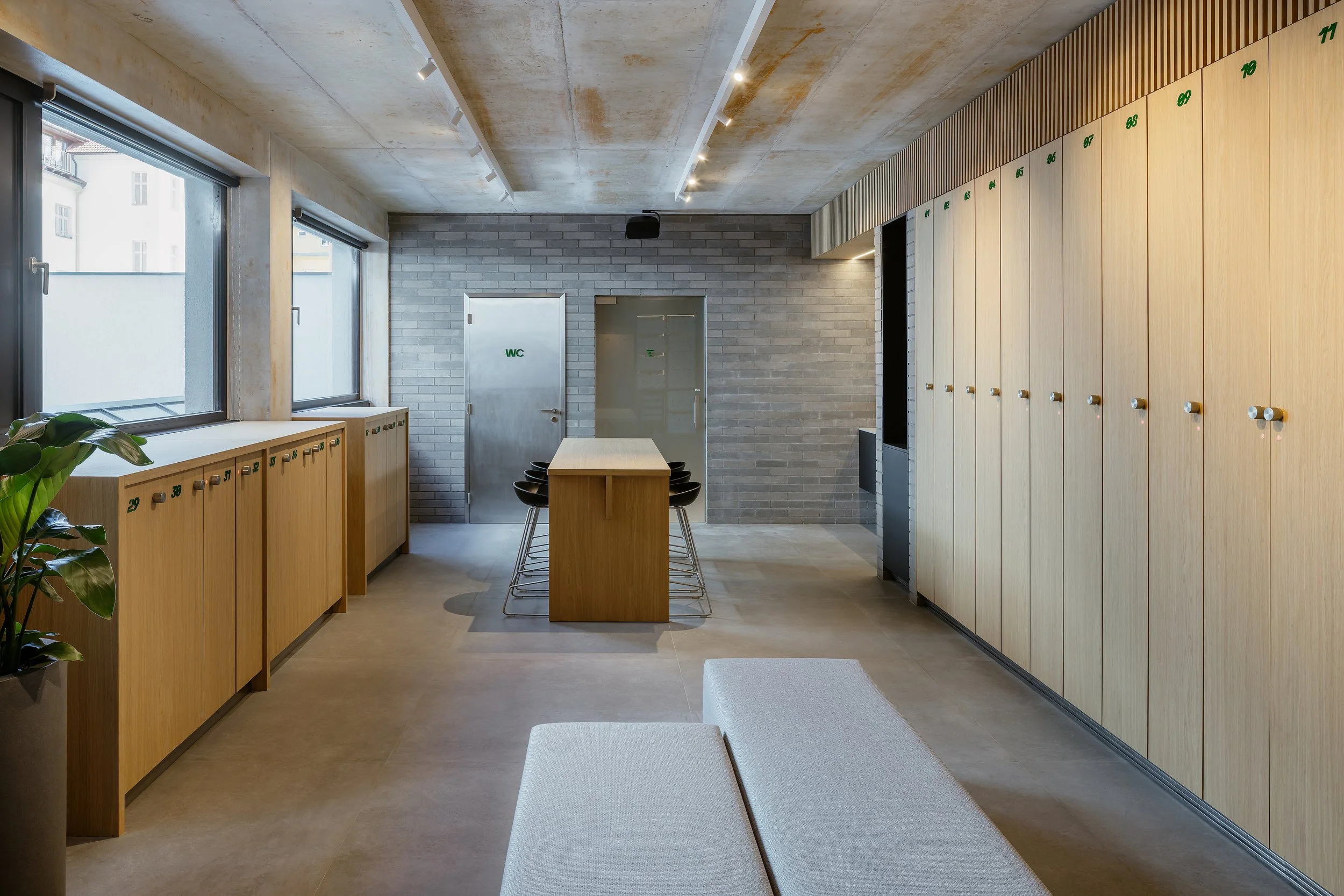 The interior architecture builds on this narrative by combining industrial character with a warm, human scale. Exposed concrete walls and ceilings reference the building’s past, while oak veneer elements soften the space and bring a sense of comfort.