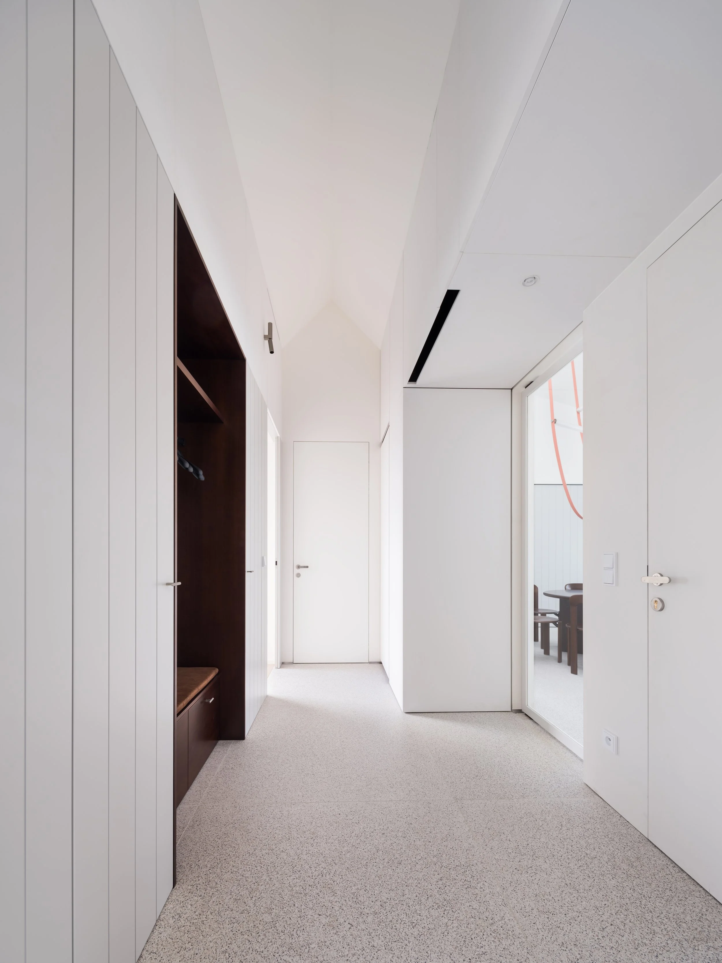 Sliding panels can transform the kitchen into an office with a single motion or seamlessly merge into a unified wall. The hallway cabinets not only lead into a deliberately designed ceiling but also house air conditioning units, heat recovery systems, a laundry zone, and a wardrobe.